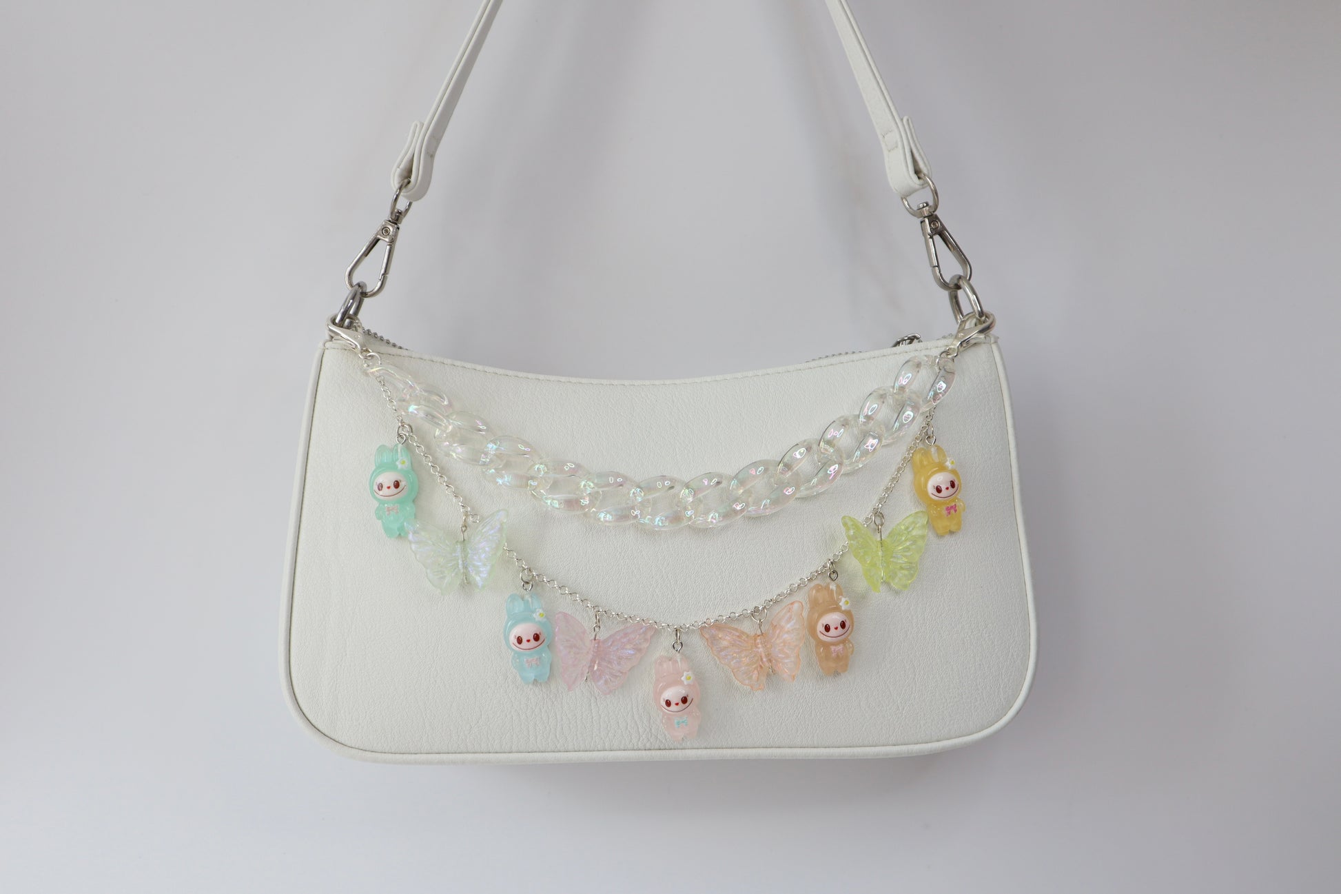 Transform your everyday bag into a conversation starter with this enchanting purse chain. Featuring whimsical monster charms and a shimmering iridescent butterfly, it combines playful personality with practical style. The clear acrylic links showcase the charming details while silver hardware adds a polished touch. Perfect for attaching to any purse or bag, this unique accessory brings a touch of magic to your daily carry. Express your individuality with a piece that's equal parts fun and fabulous.