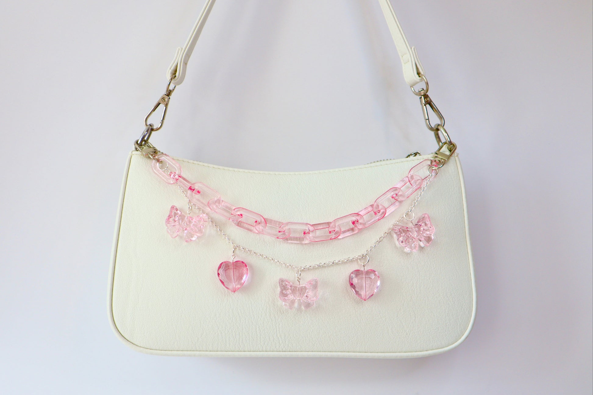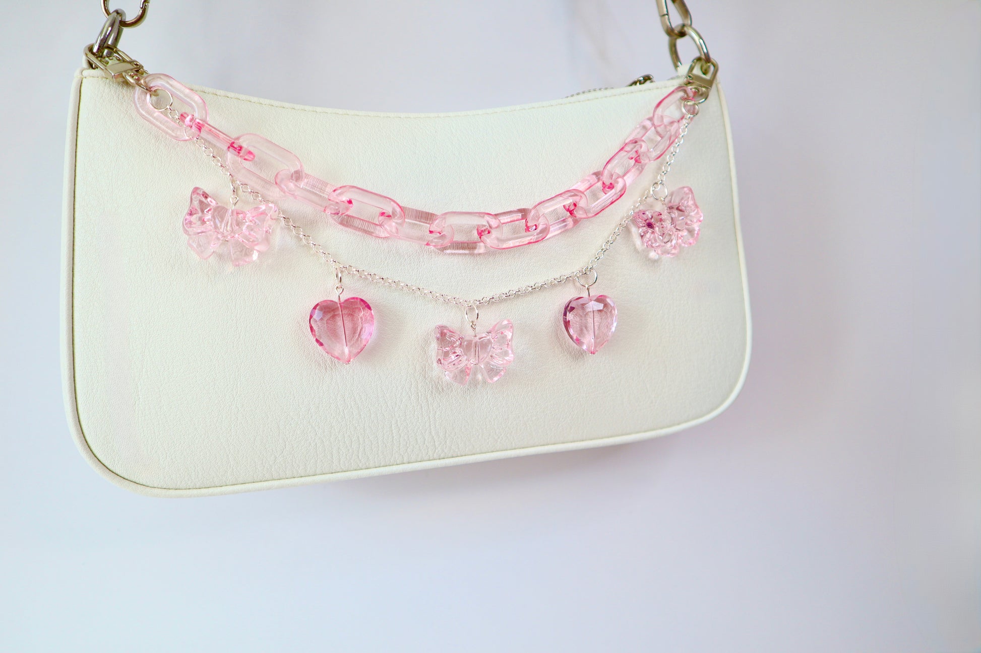 Elevate your everyday bag with this charming purse chain that combines style and functionality. Featuring delicate heart-shaped gems in soft light pink, connected by coordinating pink acrylic links, this accessory brings a touch of romance to any handbag. The silver hardware adds a sophisticated contrast, while the adorable pink bow detail makes it Instagram-worthy. Perfect for those who love expressing their personality through accessories, this bag chain transforms an ordinary purse into a statement piece that reflects your sweet, fashion-forward aesthetic.
