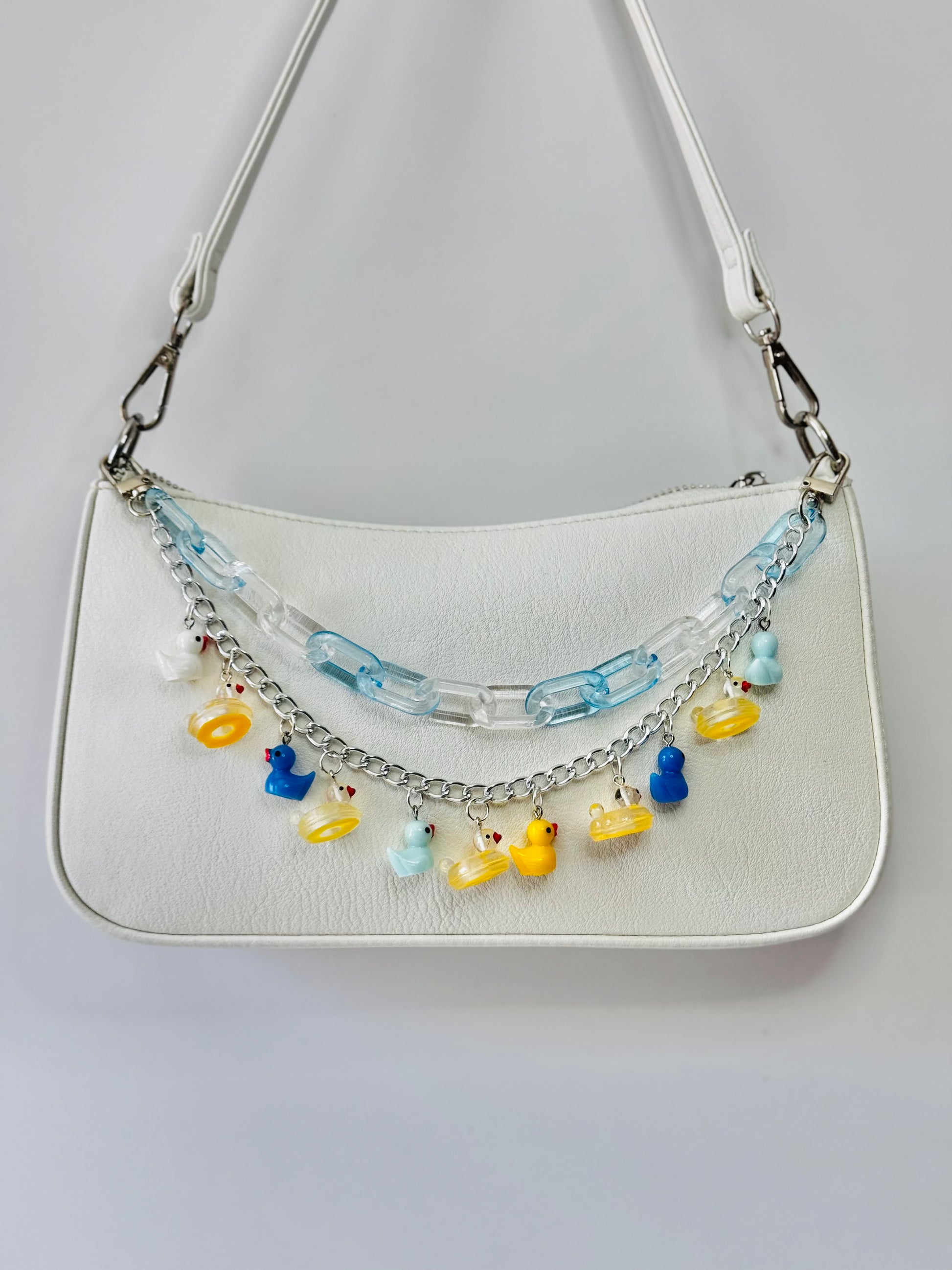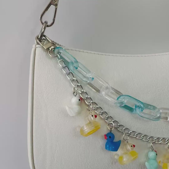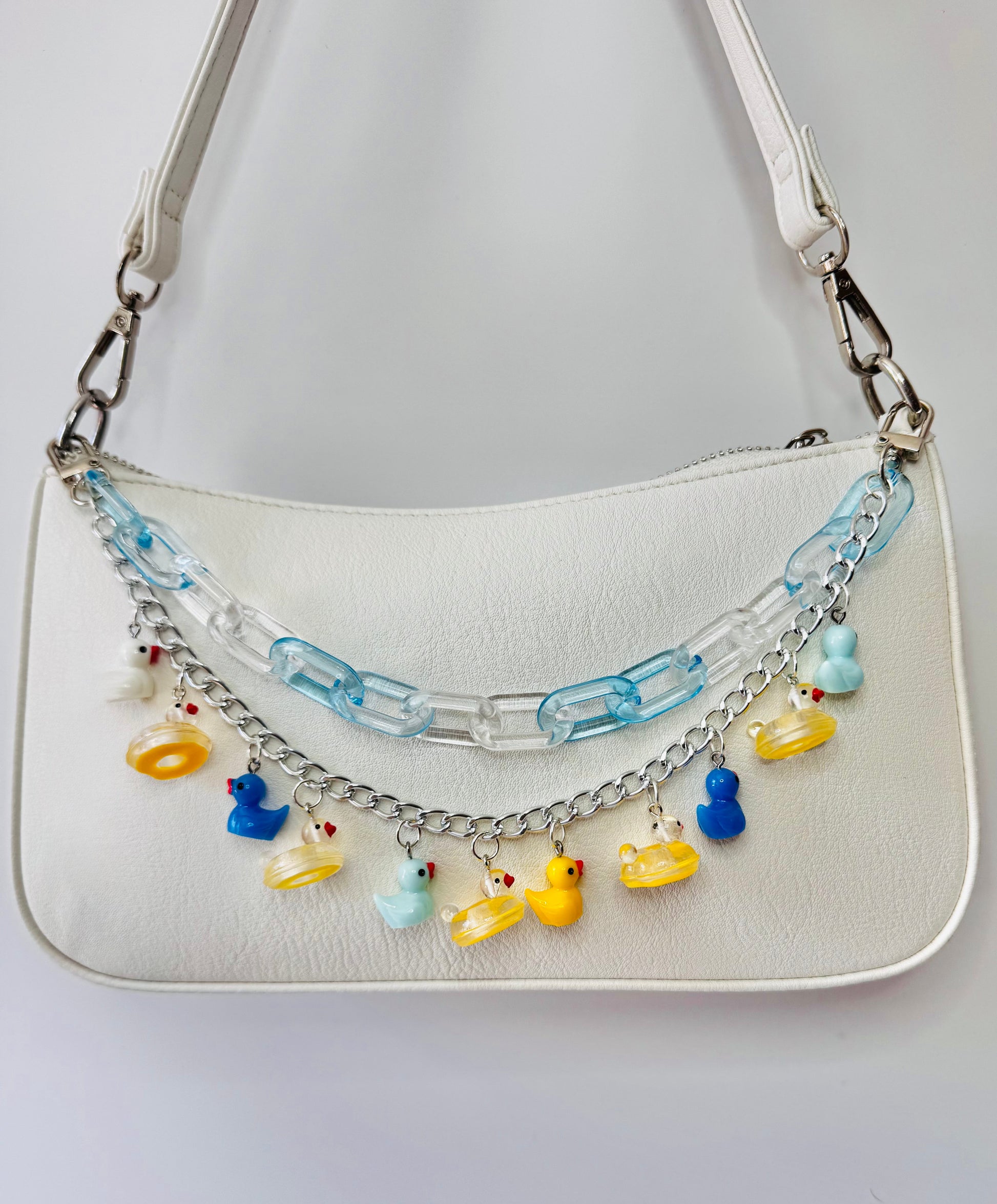Transform your bag into a statement piece with our Nautical Duck Purse Chain. This charming accessory features a blue nautical chain adorned with cheerful rubber duckies in classic blue and yellow, all finished with polished silver hardware. Whether you're upgrading a clutch, crossbody, or tote, this playful chain adds instant personality and functionality. The durable construction keeps your bag secure while the whimsical design sparks joy every time you carry it. Embrace your love of nautical style and quirky accessories—this is the perfect way to showcase your unique fashion sense and make waves wherever you go.
